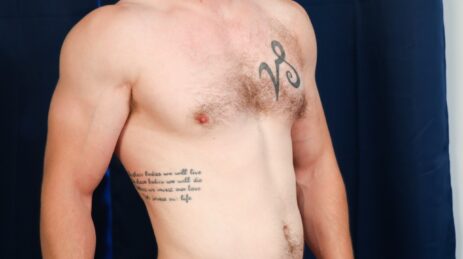 Cute freckled gay stud Sebastian Woods from the American army-themed gay porn site Active Duty gets naked and show off his big cut cock to the camera